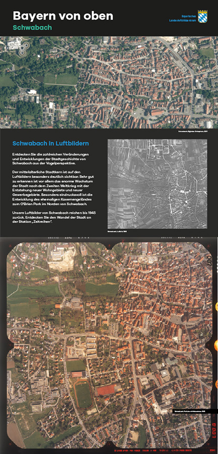 Anlässlich des fünfjährigen Bestehens des Bayerischen Landesluftbildzentrums stellte die Wanderausstellung dessen Angebote einem breiten Publikum vor. Die multimedial gestaltete und leicht verständlich aufbereitete Ausstellung vermittelt einen spannenden Einblick in die Geschichte und Technik der Luftbildfotografie. Auf 14 Ausstellungstafeln wurde den Besucherinnen und Besuchern gezeigt, wie Luftbilder gemacht werden, wie sie aufbereitet werden und wo sie eingesetzt werden.